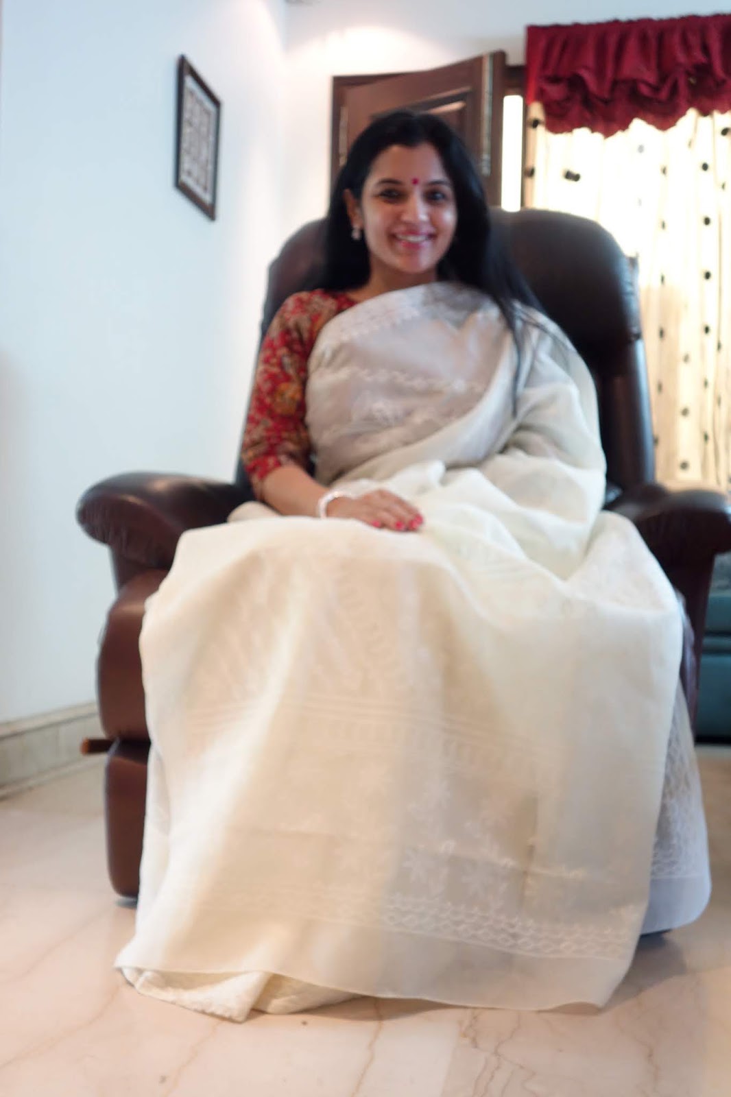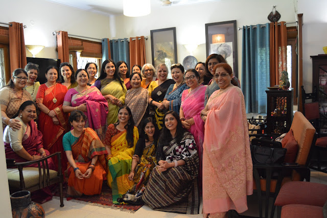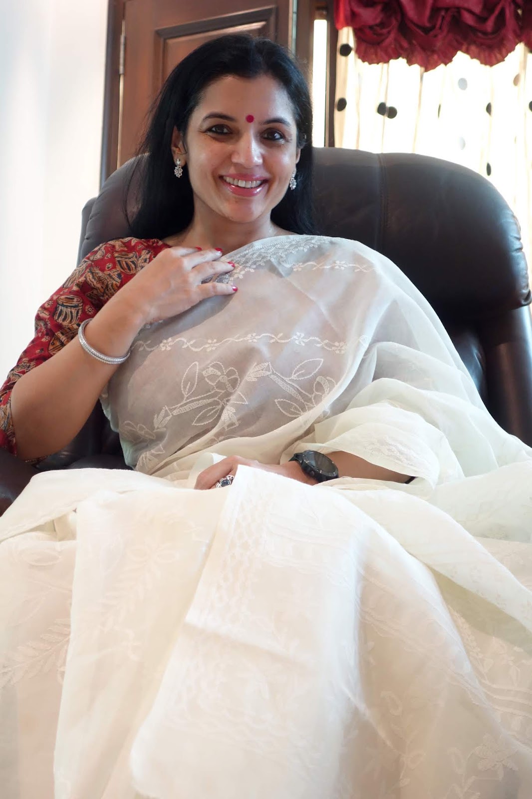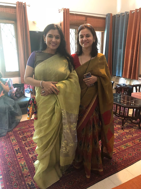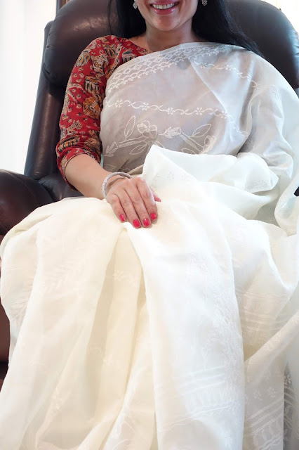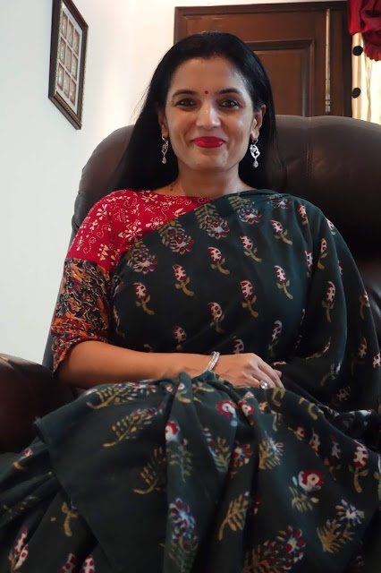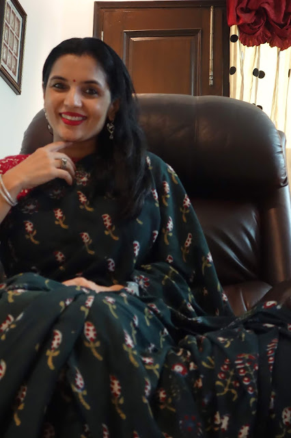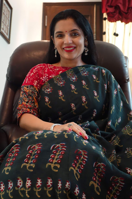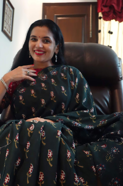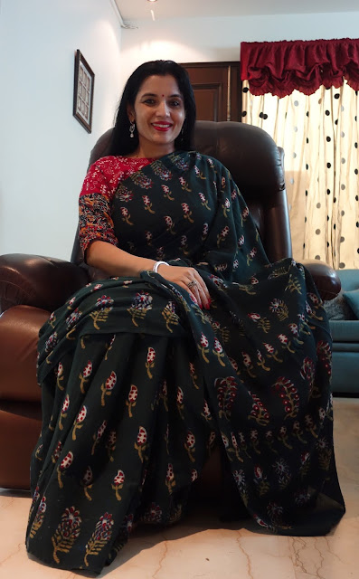 The print requires four stages of printing as each motif requires four blocks to complete the print. This particular collection is made using eco-friendly natural dyes. Alizarin, indigo and pomegranate peel are used for the red, blue yellow and green colour. Mud resist has been used in the final two stages to prevent the colours penetrating the white areas on the buti. These sarees are made on soft cotton mul. These prints are made using over 50 years old blocks, each buta is made using four blocks for the four colours, white, red, yellow and green. The green is achieved by dying the fabric blue with indigo and then a dipped in pomegranate peel water gets the yellow and green. The process takes 8-10 days to print a Saree. The Nandana prints consist of mainly five butas, the largest one is jalam, the long one is Amba, a single flower is champakali and the smallest is mirchi buta. A pair of flowers is also used in these blocks which are interestingly called the dhola maru!