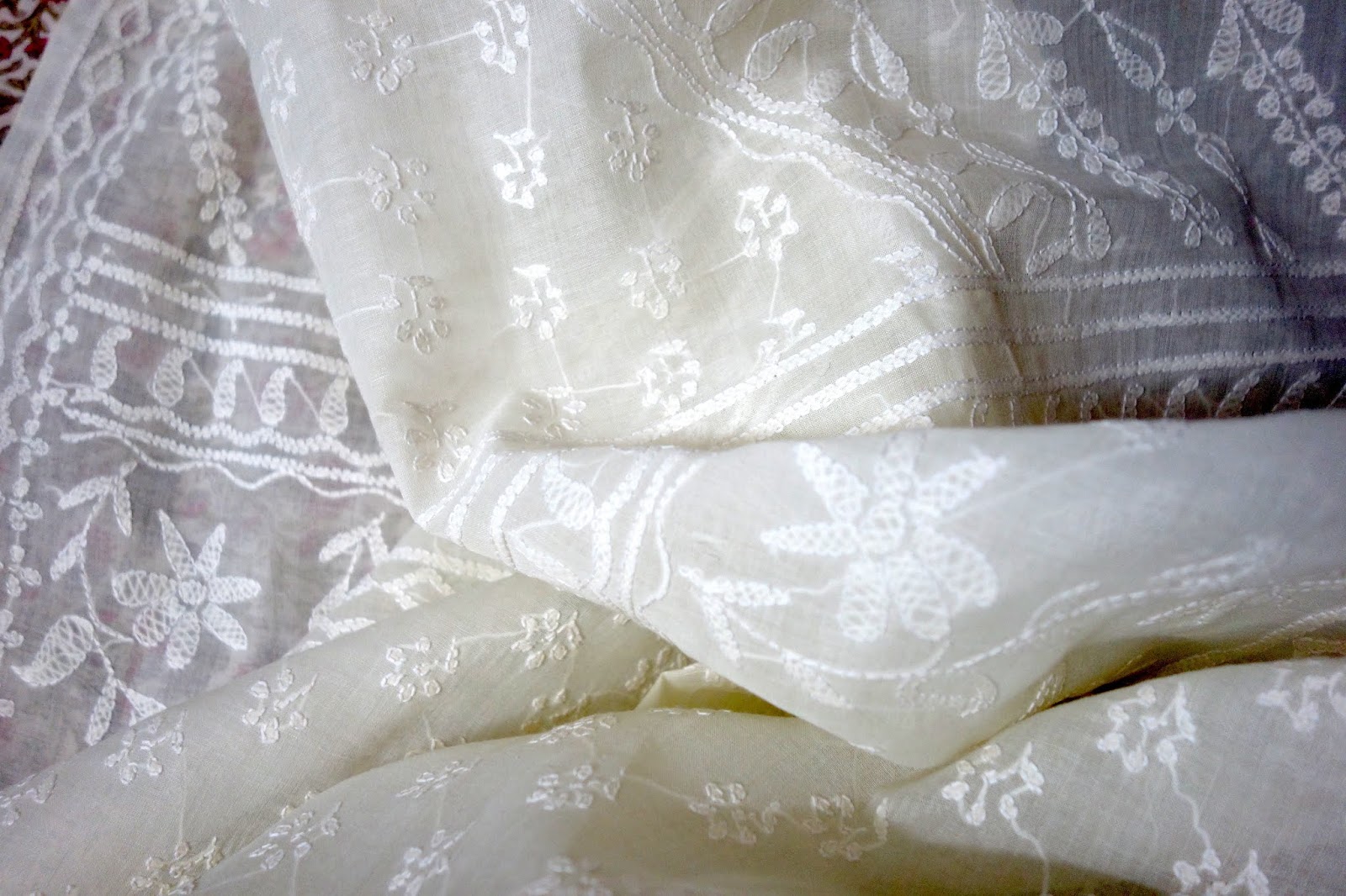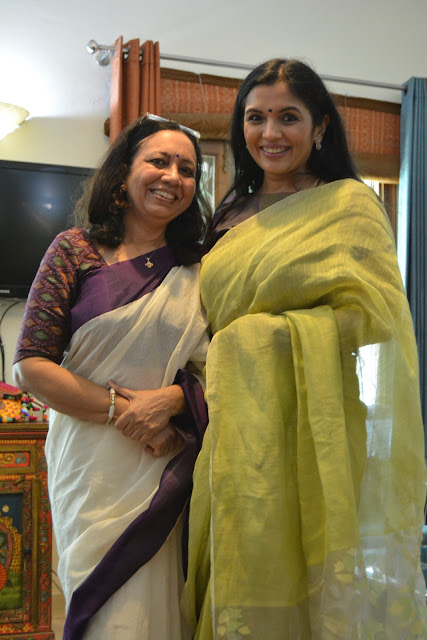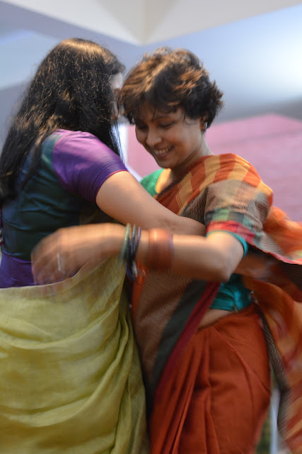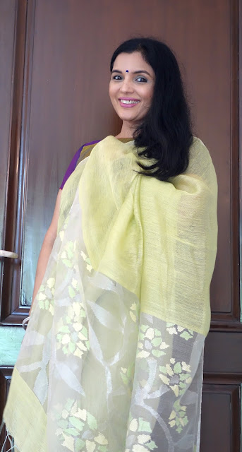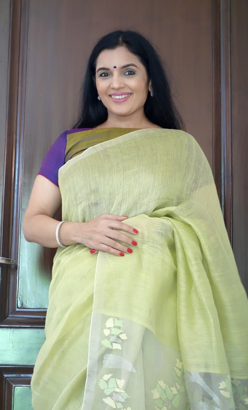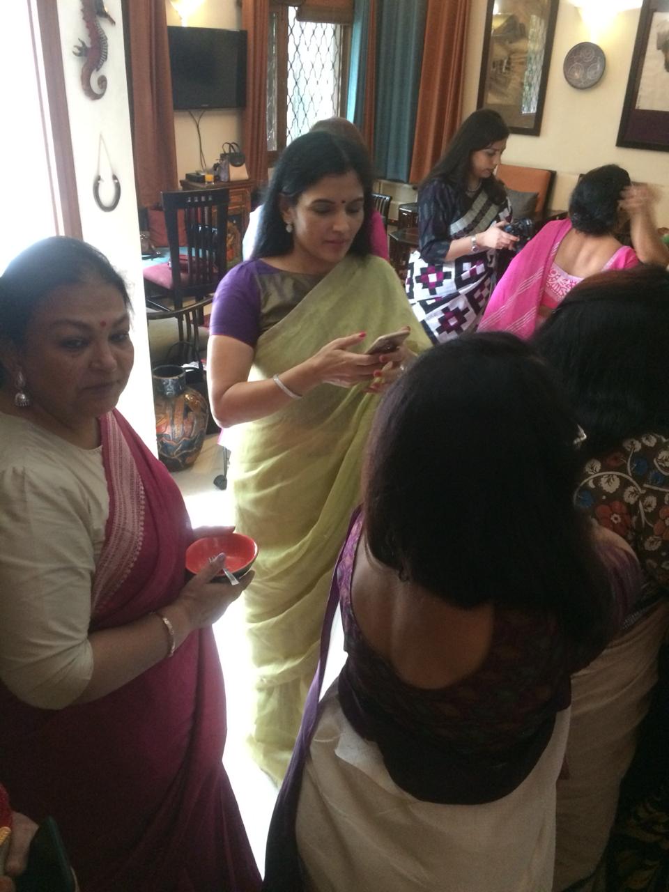 The print requires four stages of printing as each motif requires four blocks to complete the print. This particular collection is made using eco-friendly natural dyes. Alizarin, indigo and pomegranate peel are used for the red, blue yellow and green colour. Mud resist has been used in the final two stages to prevent the colours penetrating the white areas on the buti. These sarees are made on soft cotton mul. These prints are made using over 50 years old blocks, each buta is made using four blocks for the four colours, white, red, yellow and green. The green is achieved by dying the fabric blue with indigo and then a dipped in pomegranate peel water gets the yellow and green. The process takes 8-10 days to print a Saree. The Nandana prints consist of mainly five butas, the largest one is jalam, the long one is Amba, a single flower is champakali and the smallest is mirchi buta. A pair of flowers is also used in these blocks which are interestingly called the dhola maru!