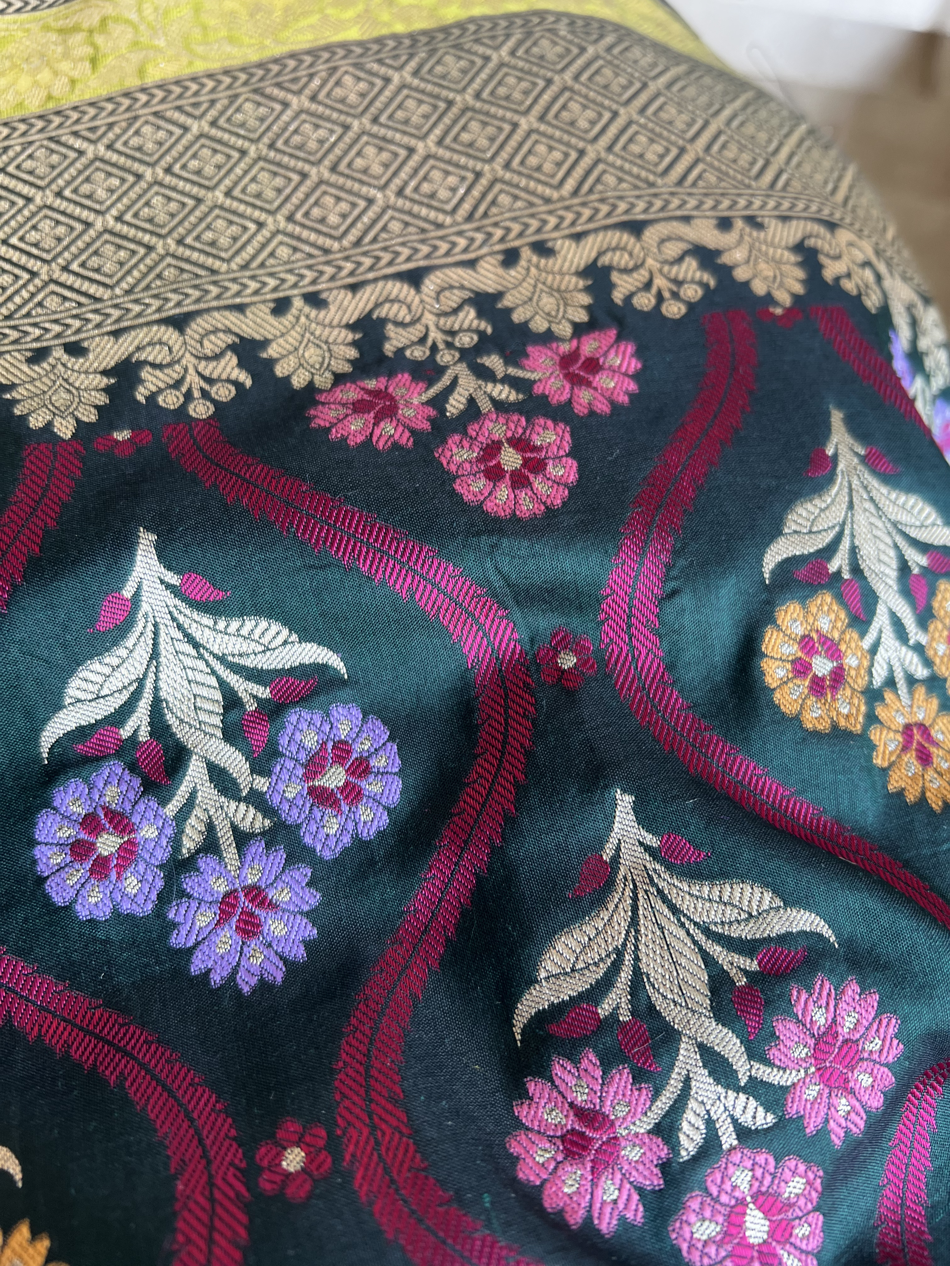Crafted with meticulous attention to detail, our latest collection features the luxurious Emerald Green Pure Katan Silk with exquisite Kaduwa weaves. Each piece is a testament to the artistry and skill of traditional Indian craftsmanship, showcasing the timeless beauty of Meenakari floral butis.
